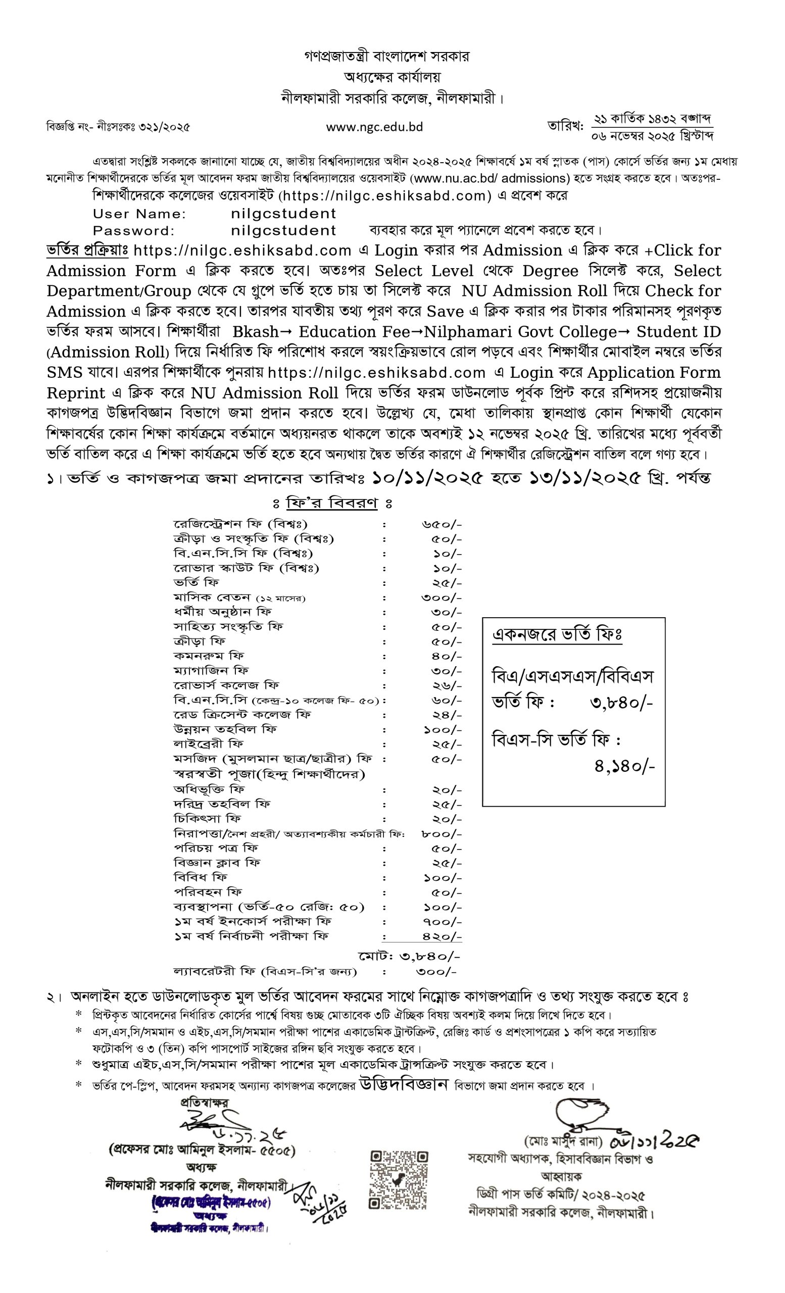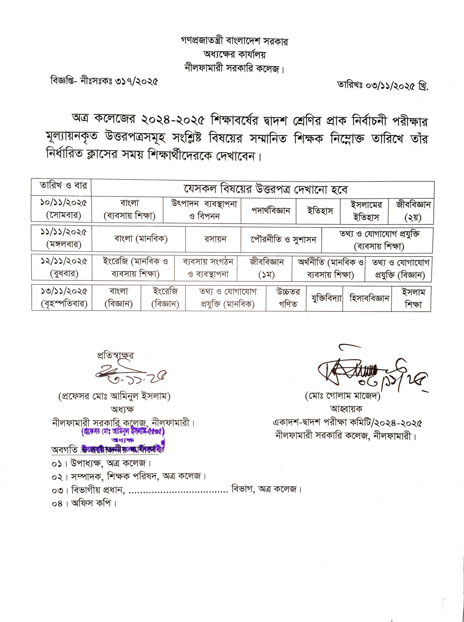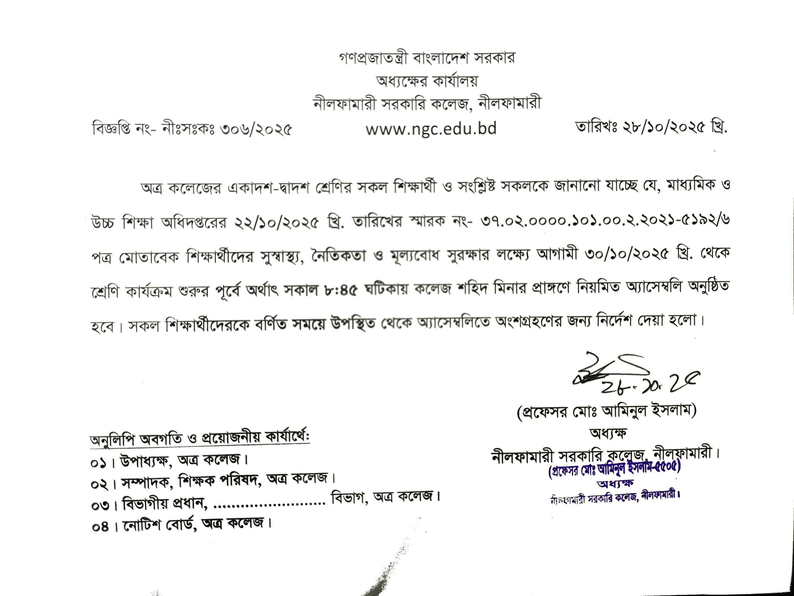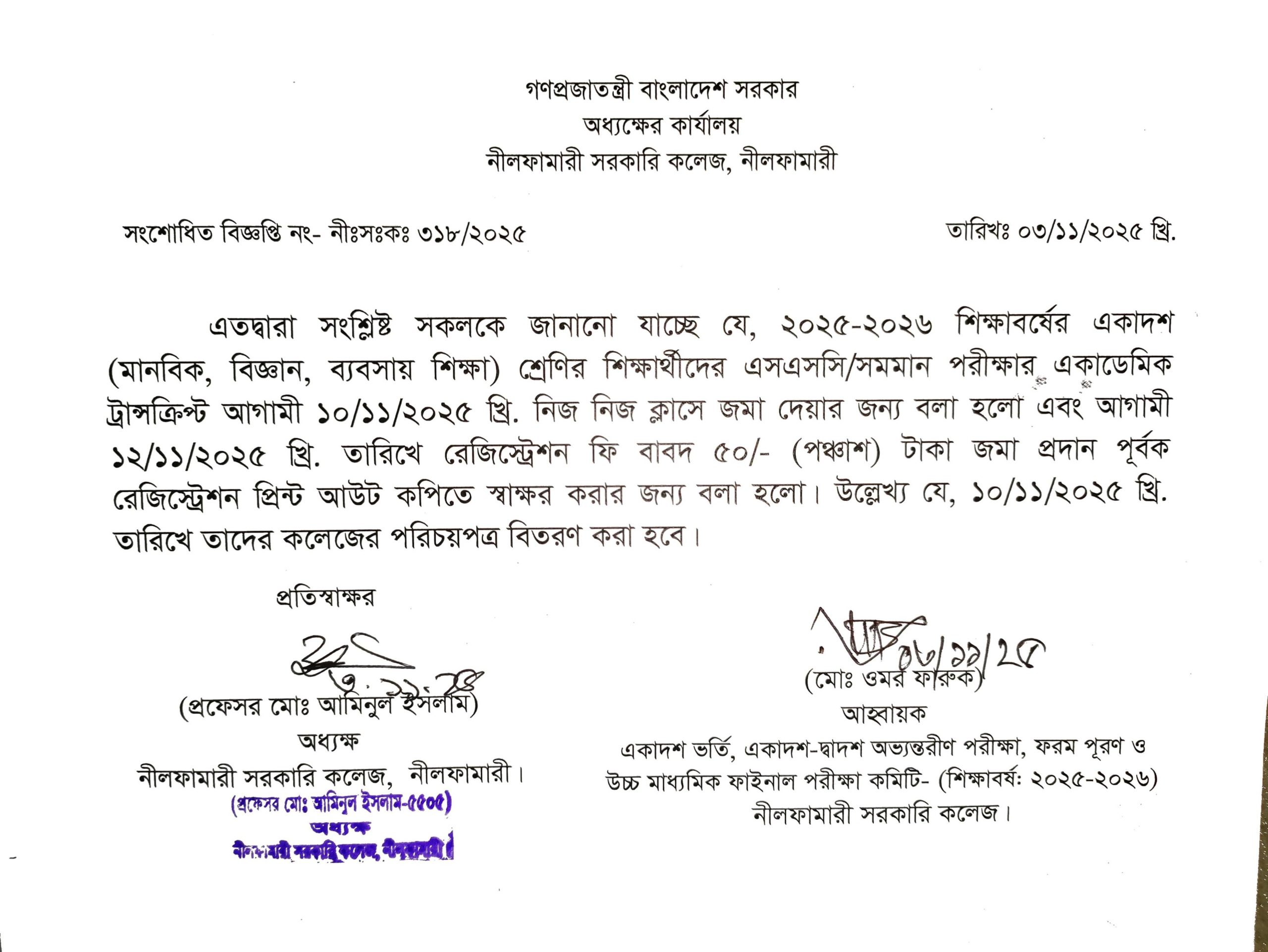 | 6 | একাদশ শ্রেণীর শিক্ষার্থীদের একাডেমিক ট্রান্সক্রিপ্ট জমা ও রেজিস্ট্রেশন প্রিন্ট আউট স্বাক্ষর | November 3, 2025 | |