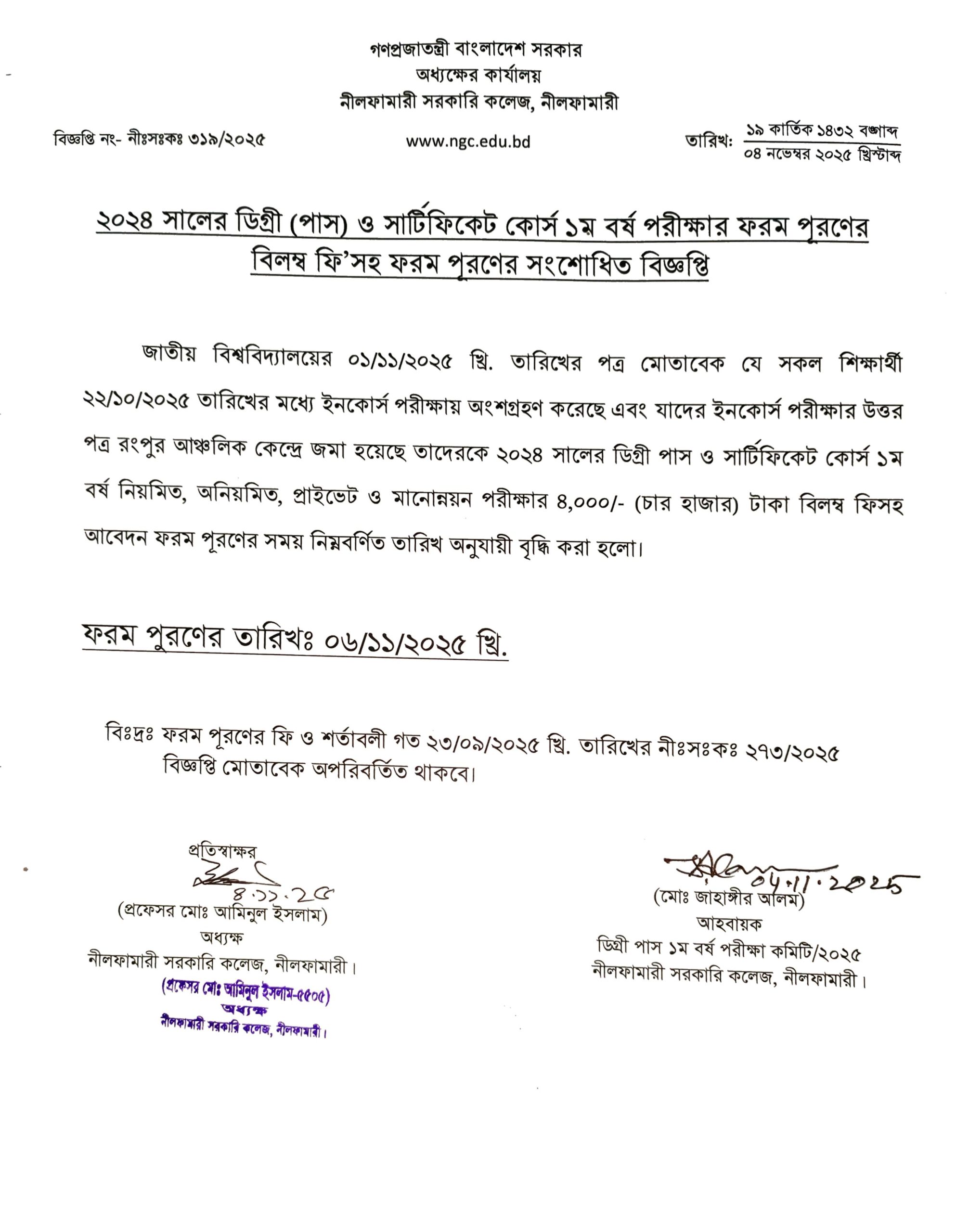 | 4 | ডিগ্রী পাস প্রথম বর্ষ ফরম পূরণের সময় বৃদ্ধিকরণের বিজ্ঞপ্তি | November 4, 2025 | |