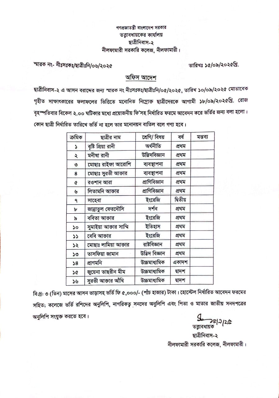 9 ছাত্রীনিবাস ২ ভর্তিযোগ্য শিক্ষার্থীর তালিকা September 16, 2025