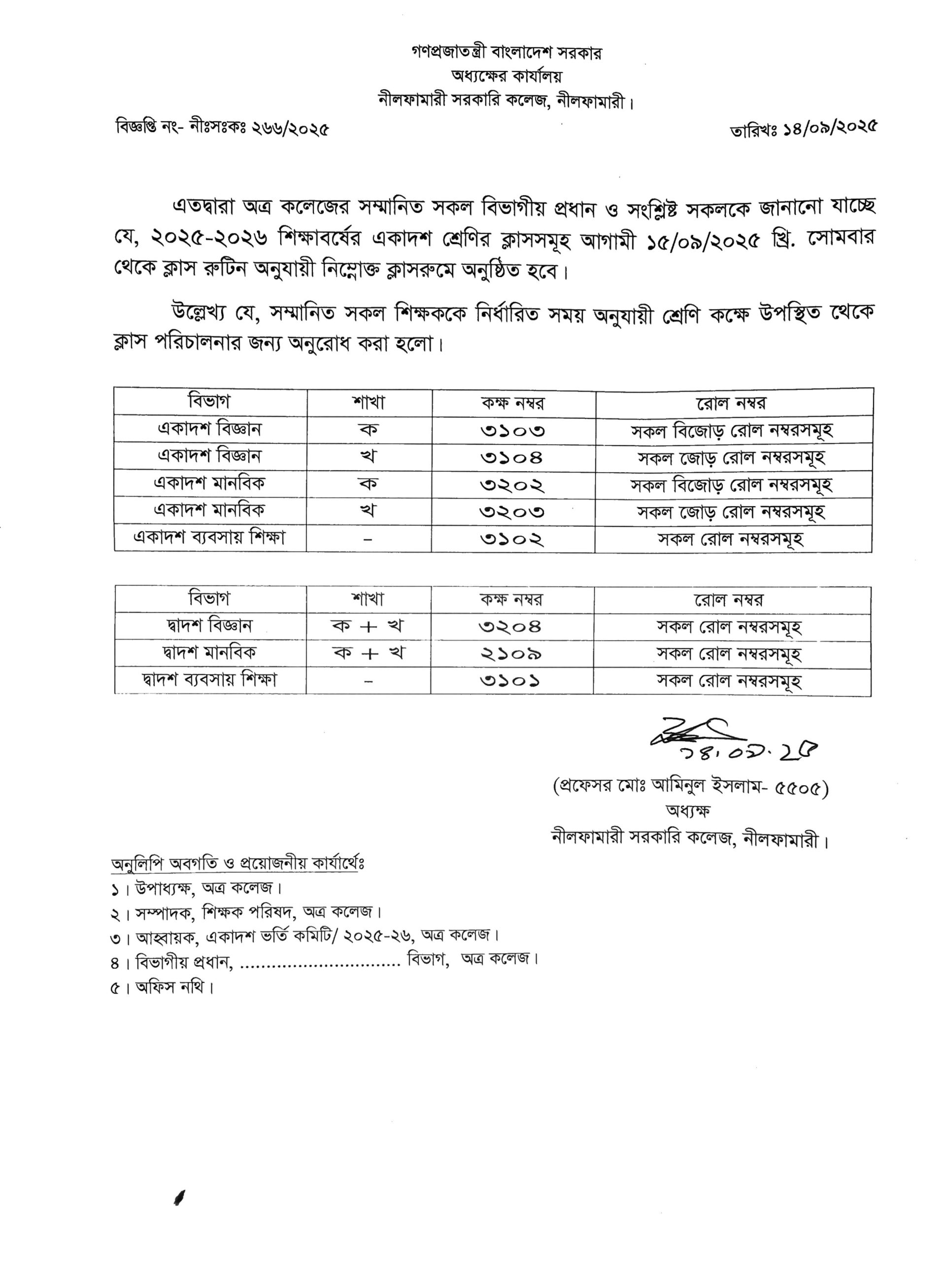 ২০২৫-২০২৬ শিক্ষাবর্ষের একাদশ শ্রেণিকক্ষের তালিকা |